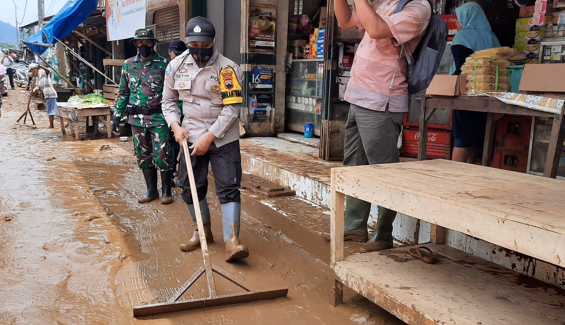 Petugas Polres Cilacap bantu bersihkan lumpur di Pasar Karanggendot Desa Limbangan, Kamis (28/10/2021). Banjir dan longsor di sana mengakibatkan 4 keluarga mengungsi karena rumah terancam. (haryadi nuryadin/bercahayanews.com)
