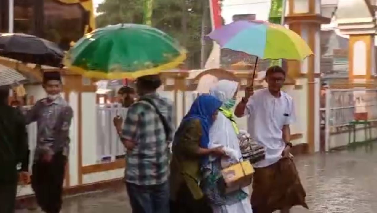 Dan saat pulang ke kota pemberangkatan inilah, para jemaah haji asal Cilacap ini disambut dengan hujan deras. Hujan ini sudah turun begitu bus yang membawa para jemaah tiba di di halaman Masjid Mujahidin Majenang, Cilacap. Sejumlah petugas penjemput segera mempersiapkan payung dan mengarahkan para jemaah haji langsung menuju dalam masjid.
