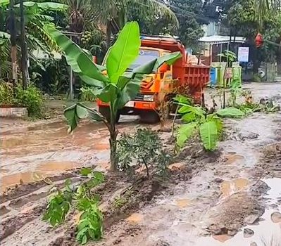 Seperti yang ada di akun instagram @patisakpore. Jalan tersebut sudah tidak ada tersisa lapisan aspal. Namun justru jadi kubangan akibat terkena air hujan. Hal ini membuat sebuah truk harus melintas dengan sangat hati-hati, agar tidak terguling.