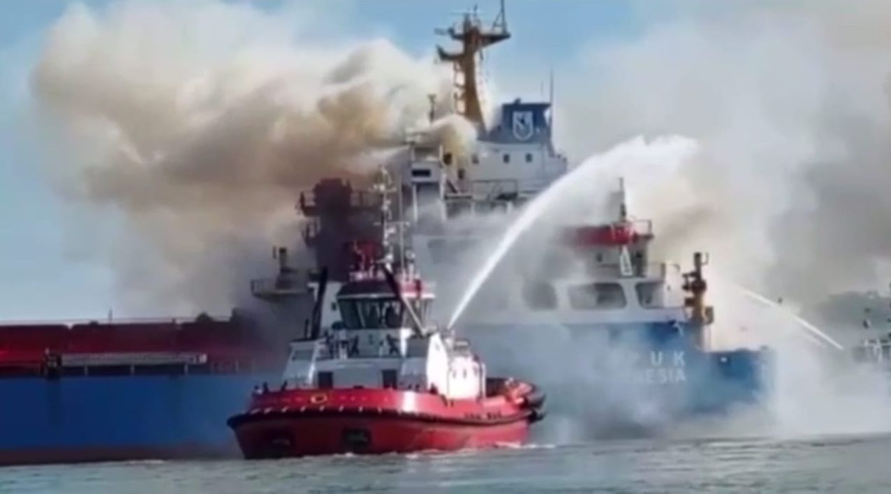 Kapal Soemantri Brodjonegoro yang membawa pupuk Pusri sudah kosong. Tidak ada pupuk yang ikut terbakar saat insiden terjadi, Rabu (1/12/2021). (doc)