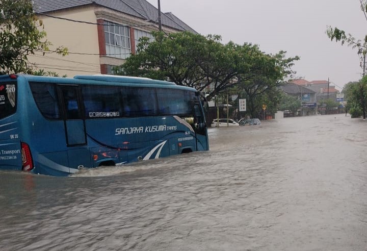 Satu unit bus menerjang banjir di pusat kota Denpasar, Bali. Banjir di Bali terjadi akibat hujan deras sejak Selasa (9/9/2025) hingga Rabu (10/9/2025). (doc/istimewa)