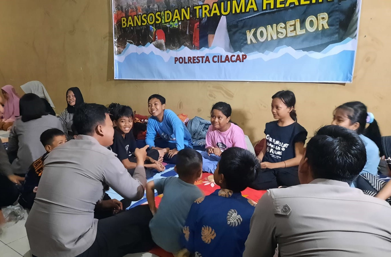 CILACAP – Petugas Polresta Cilacap, mencoba menenangkan kondisi psiskologis anak dan para pengungsi korban tanah longsor yang bertahan di balai Desa Cibeunying Kecamatan Majenang, Cilacap, Minggu (16/11/2025) malam. Caranya dengan penguatan mental melalui trauma healing.