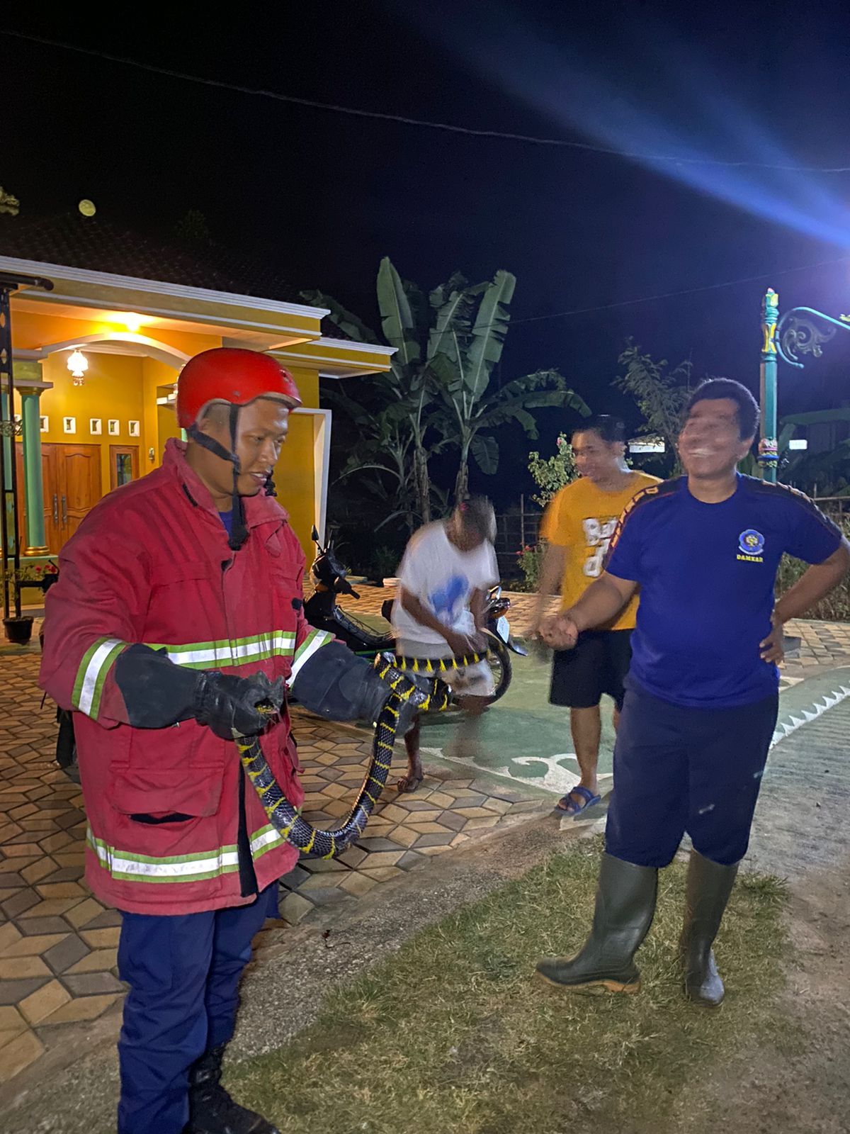 Mendapati laporan ini, petugas Pos Damkar Kroya bergegas menuju alamat Ngali di Desa Pucung Kidul. Petugas sudah membekali diri dengan peralatan lengkap. Termasuk pakaian yang bisa melindungi mereka dari ular.