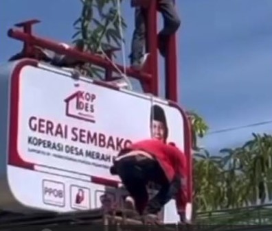 Di video ini nampak para pekerja menurunkan baliho dan billboard bergambar Presiden Prabowo Subianto. Pekerja juga menarik barang-barang milik mitra dari koperasi Desa Pucangan Kabupaten Tuban. (*)